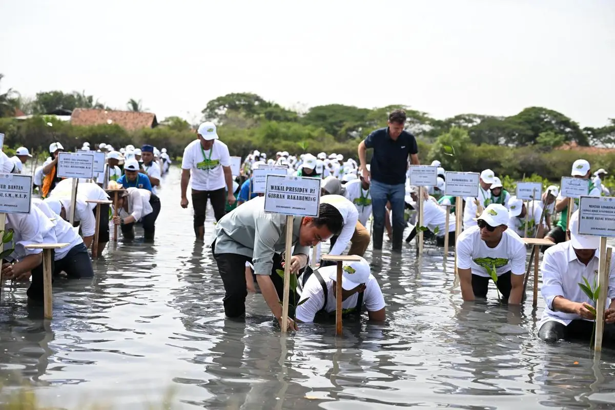 Kegiatan ini turut dihadiri oleh Menteri LHK Siti Nurbaya Bakar, Pj Gubernur Banten Al Muktabar, dan ratusan relawan. Mereka menanam ribuan bibit di area lima hektare yang sebelumnya rusak akibat abrasi dan penebangan liar. Siti Nurbaya, dalam pernyataannya kepada Tempo.co, menegaskan pentingnya peran masyarakat dalam merawat bibit mangrove agar program rehabilitasi dapat berjalan berkelanjutan.